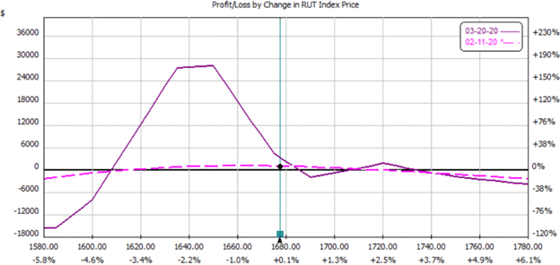 When the underlying price moves above the butterfly’s expiration tent, the trade is adjusted into a hybrid structure.
