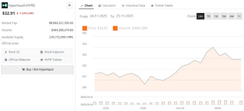 Hyperliquid’s current price is $32.90, down -1.62% in the last 24 hours. Source: Brave New Coin