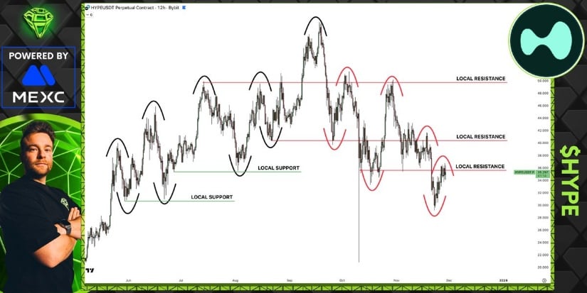 This comes as the market reacts to fresh supply hitting the books, major technical inflection points, and a descending-channel structure that is beginning to tighten. Participants are watching closely to see whether HYPE can stabilize above the $31 to $32 band or if a deeper liquidity sweep unfolds.