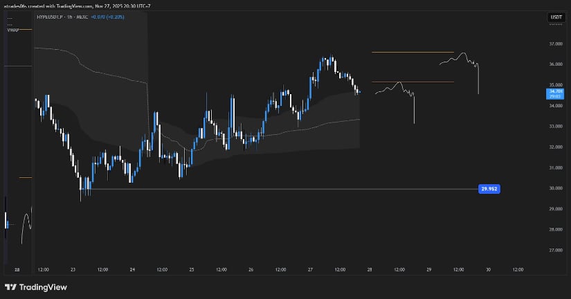 If HYPE loses the $31 to $32 support cluster, the chart opens room towards $29.50, the important liquidity zone highlighted.