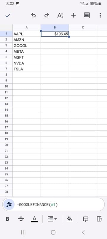 To get the stock prices for the rest of the list, we can copy the cell B1 and paste that formula down like so: