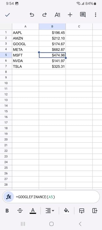 Suppose we want to get the prices for a list of stocks, say the Magnificent Seven stocks listed here in alphabetical order by symbol: