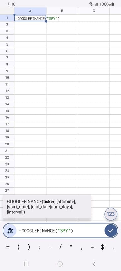 In our example, we passed the ticker symbol “SPY” into the googlefinance function.