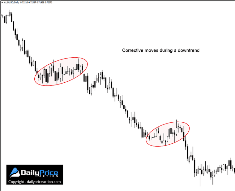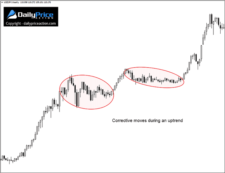 In summary, corrective moves are typically comprised of a mixture of bullish and bearish candles. The same goes for both uptrends and downtrends.