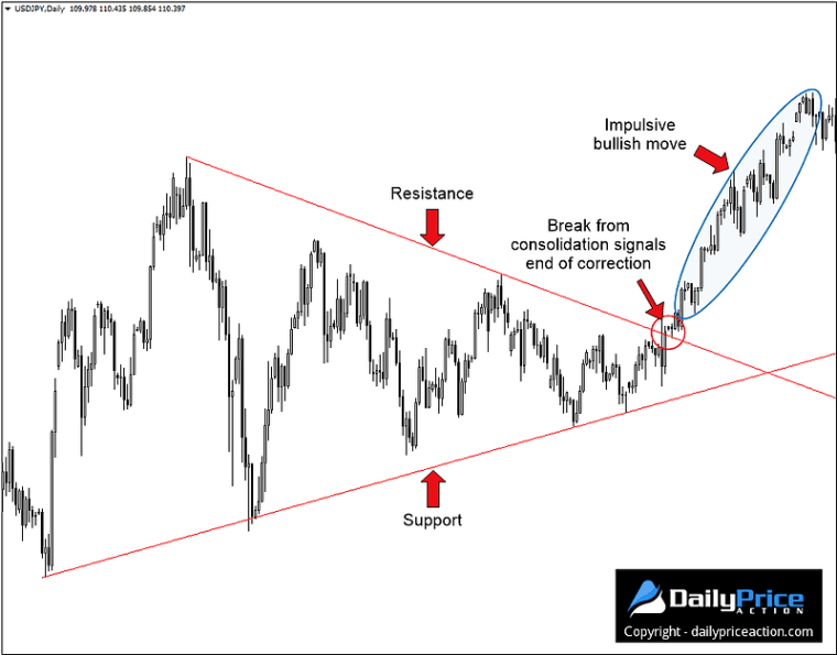 Markets don’t move in straight lines, so impulsive and corrective moves refer to the market’s “ebb and flow.” This helps a trader differentiate between a trending price action and consolidation.