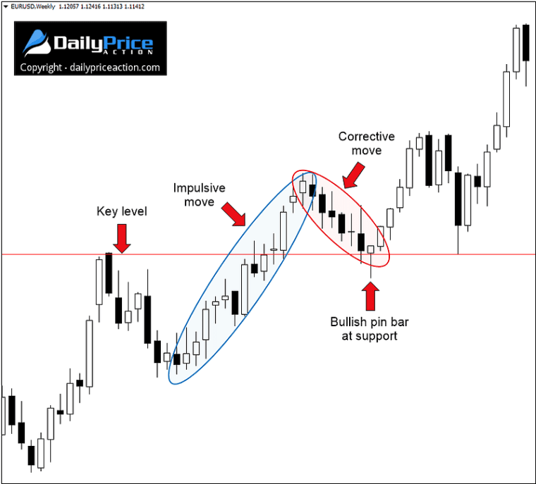We can, therefore, say that the very best pin bars are the ones that occur at the end of a corrective move and form at support or resistance. The idea is to position ourselves to catch the next impulsive wave as soon as it begins.