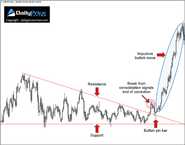Note that in this case, the pair not only carved out a wedge pattern but also formed a bullish pin bar following the break from consolidation.