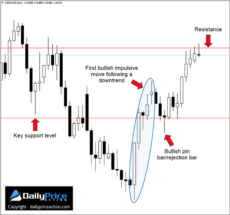 Take the USDCAD daily chart below. Here we have a bullish pin bar/rejection bar that formed at new support. This formation came after the pair carved out its first impulsive bullish move in several months.
