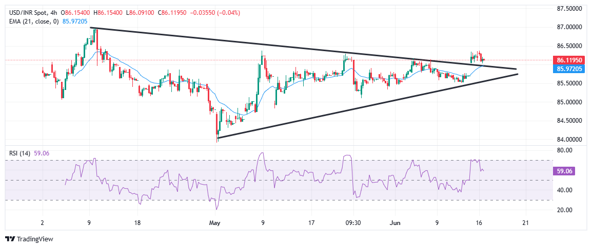 The USD/INR pair has recently broken out of a multi-week symmetrical triangle pattern on the 4-hour chart, signaling a potential shift in short-term bias. However, after reaching near 86.50, prices are struggling to sustain momentum above the upper trendline. The pair is currently hovering near 86.07, modestly above the 21-period Exponential Moving Average (EMA) at 85.97, suggesting that buyers still have a slight advantage as long as prices hold above this moving average support.