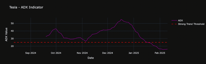 The Average Directional Index or ADX indicator can be used to measure the strength of a trend. For instance, if Tesla’s stock is surging and you’re wondering whether the trend is strong enough to warrant holding onto your position, ADX can provide clarity. It ranges from 0 to 100, with values above 25 indicating a strong trend.