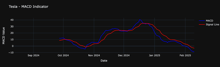 Moving Average Convergence Divergence or MACD combines two EMAs to identify momentum and potential entry/exit points. Let’s say you’ve noticed Tesla’s price moving sideways and want to predict the next big move. The MACD can help by revealing shifts in momentum. The MACD line crossing above the signal line indicates potential bullish momentum, while a crossover below suggests a potential bearish move.
