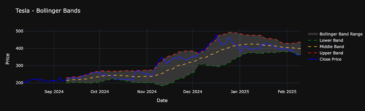 Bollinger Bands consist of a moving average and two standard deviation lines above and below it. They help visualize price volatility and potential breakouts. Imagine you’re waiting for Tesla’s price to break out from a range. Bollinger Bands can show when volatility is increasing.