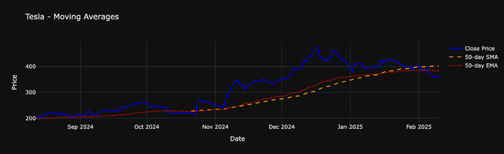 One interpretation of the above plot can be that the close price of Tesla is above its 50-day SMA and 50-day EMA indicating a potential bullish trend.