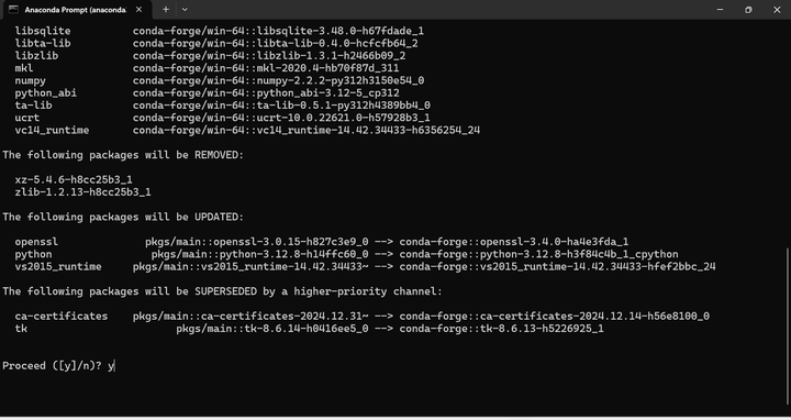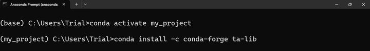 You would then write the code, “conda install -c conda-forge ta-lib”, and press the “Enter” key.