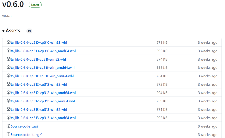 One should note that you should download the file keeping your Python version and Windows architecture (32 bit or 64 bit) in mind. E.g. Since we have the python version 3.13 installed and 64 bit Windows 11 system, we will download the file, “ta_lib-0.6.0-cp313-cp313-win_amd64.whl”.