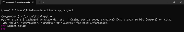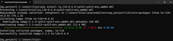 Since we have downloaded the file, “ta_lib-0.6.0-cp313-cp313-win_amd64.whl”, the command would be, pip install ta_lib-0.6.0-cp313-cp313-win_amd64.whl