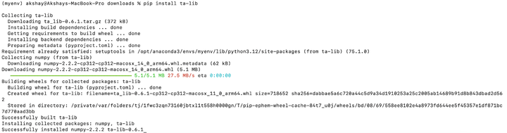 Now, we use the familiar command i.e. “pip” to install Ta-Lib on our MacOS. The command is as follows: