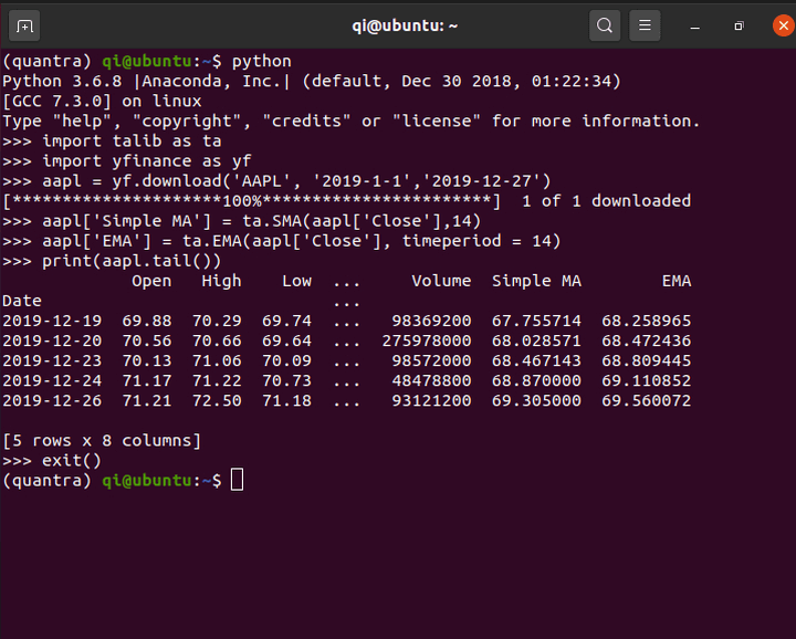 Alternatively, you can also open Jupyter notebook (or Spyder) and try to run the same code to check if the Python Ta-Lib is installed correctly.