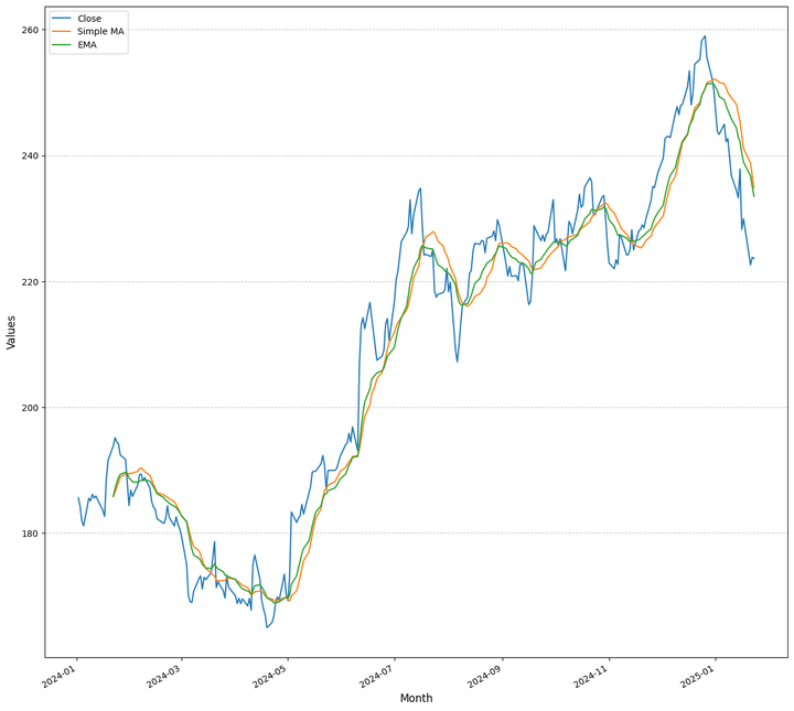 Let us start off with something simple. We will find the Simple Moving Average and the Exponential Moving Average of Apple stock data. We will use the following code: