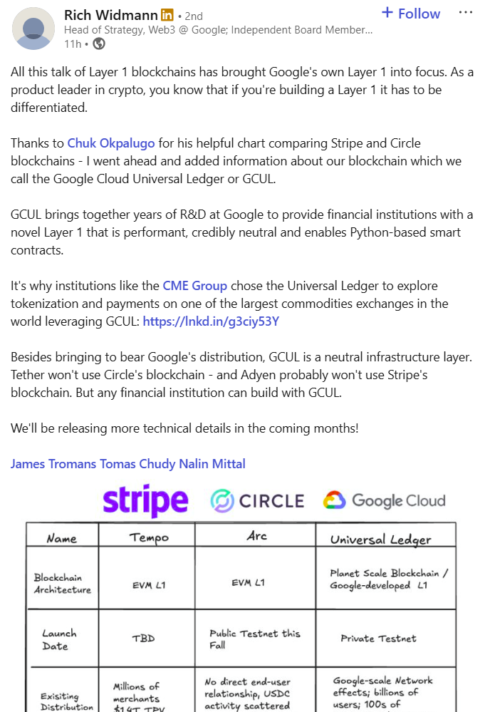 In his latest post, Widmann placed GCUL alongside layer 1 solutions developed by Circle and Stripe in a comparative chart originally shared by Chuk Okpalugo, Head of Product at Paxos. He said that Google-developed layer 1 aims to differentiate itself as a neutral infrastructure.