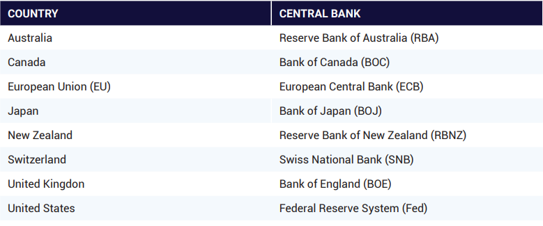 Below, you’ll find a list of central bank authorities for each of the major global economies: