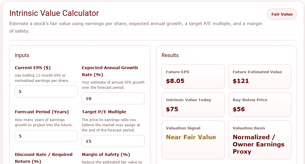 Estimate a stock’s fair value with this Intrinsic Value Calculator. Project EPS growth, apply a target P/E, discount to present value, and add a margin of safety.