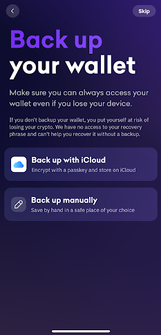 New users can simply tap the Back up with iCloud option when creating a wallet. You’ll then still have the option to manually back up your Secret Recovery Phrase for additional security.