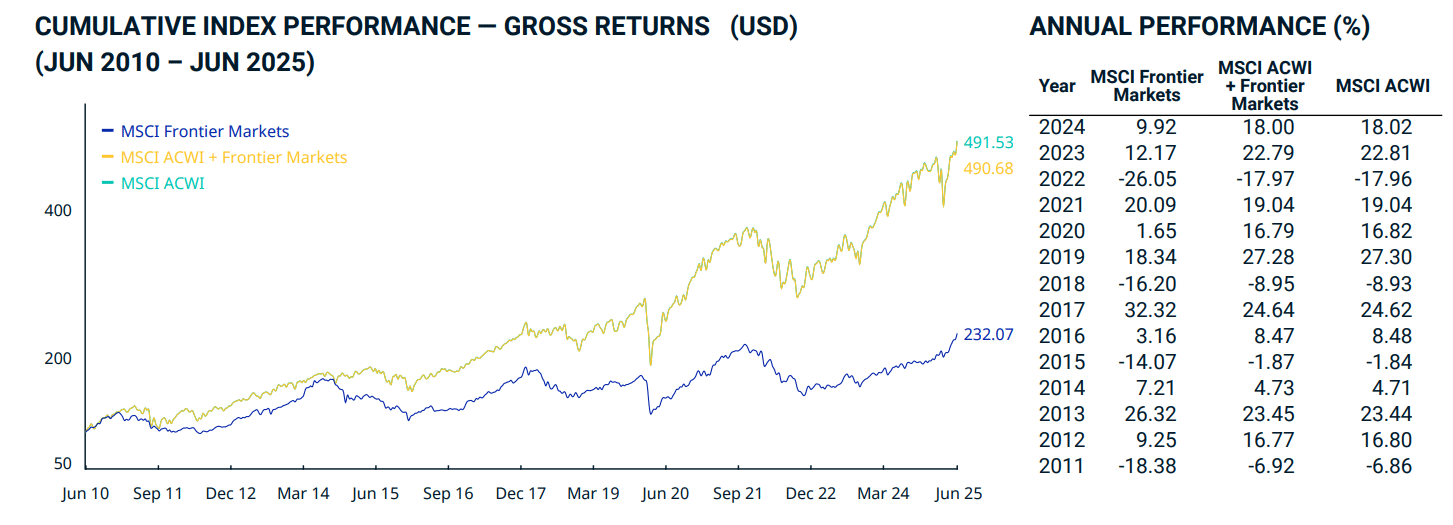 Frontier markets tend to outperform during global risk-on environments when investor appetite for yield, growth, and diversification increases.