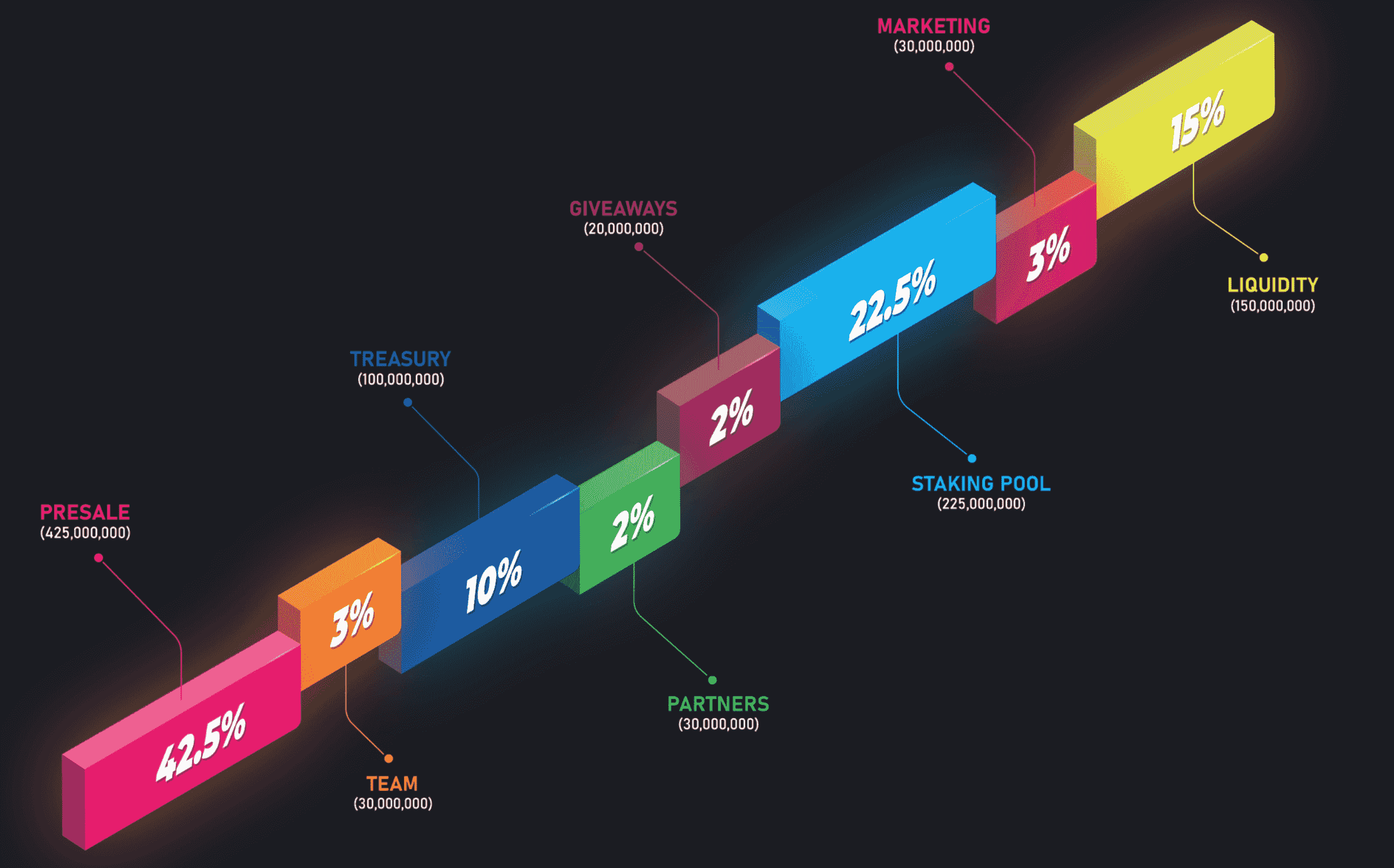 The remainder is distributed strategically across marketing, giveaways, and team allocations.