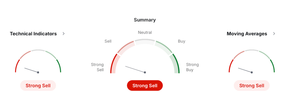 According to the latest monthly data from Investing.com, IOTX/USDT is flashing a strong bearish signal. The overall technical summary rates the token as a Strong Sell, supported by both moving averages and momentum indicators.