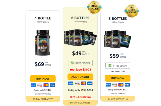 You can improve your mental well-being right now with IQ Blast Pro, which is on sale for only $49 a bottle and ships free within the United States. “Flash Memory: Hidden Tactics for Instant Memorization” and “Mind Decoder: Transforming Overthinking into Sleep Thinking” are two e-books that come with the offer and have a combined worth of more than $100. They’re meant to help with memory and problem-solving.