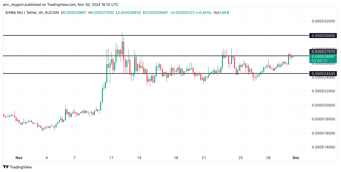 The ongoing crypto bull run, marked by Bitcoin surpassing $97,000 and Ethereum reaching $3,600, has further lifted market sentiment. This momentum has created a ripple effect, benefiting altcoins like Shiba Inu. The coin’s price has shown upward momentum in response to this broader market rally.