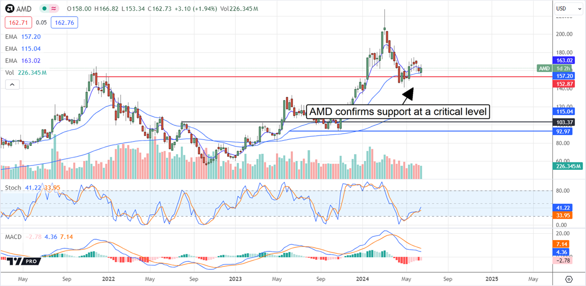 The technical action is promising. The market for AMD stock broke to a new high early in 2024 and corrected to confirm support at the prior high. The market is now showing rising support at the critical level backed by the indicators. MACD is trailing stochastic; momentum has yet to resume bullish behavior, but stochastic is firing a solid entry signal within a market that is uptrending with room to run. In this environment, AMD shares could rebound to $175 soon and $200 by year-end, with a chance of hitting new all-time highs in 2025.