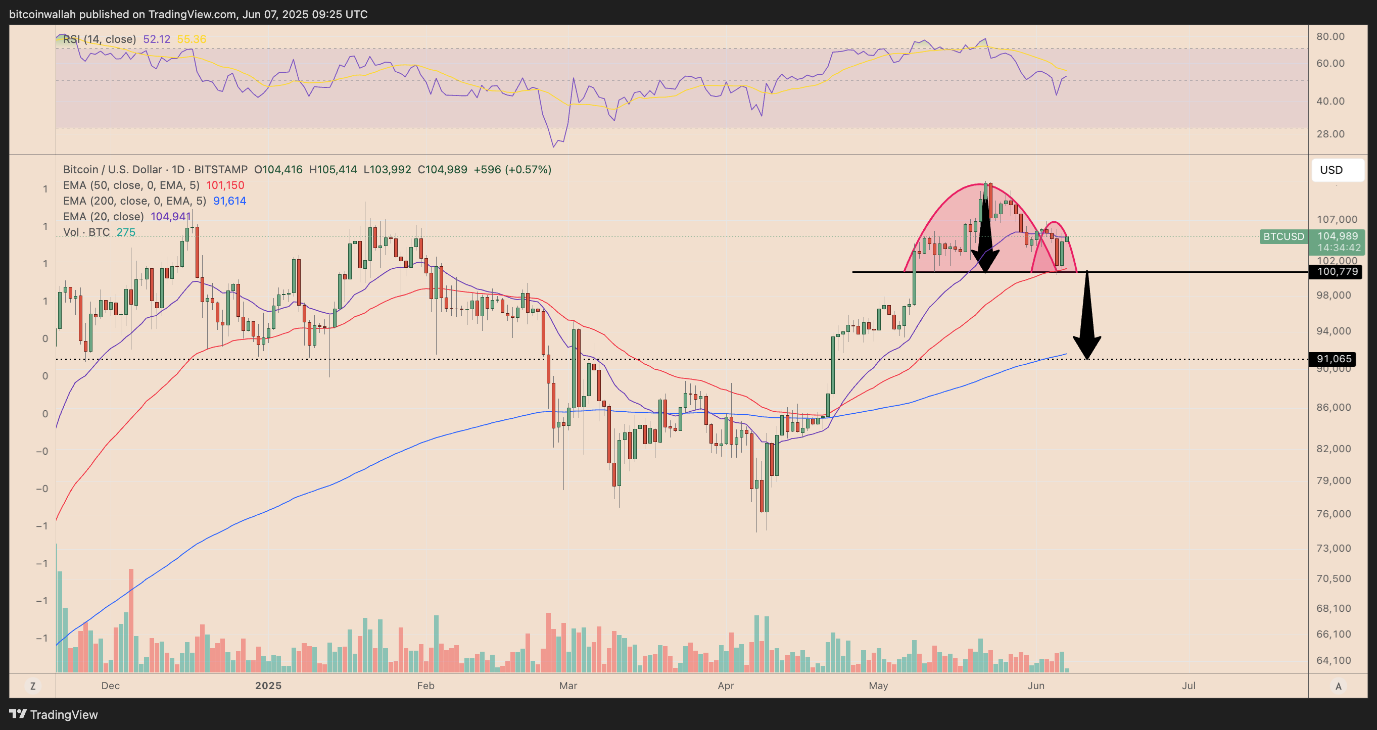 Bitcoin is painting what appears to be an inverse cup-and-handle pattern, with its neckline near $100,800 acting as current support. As of June 7, the price has entered the handle-formation stage, eyeing a breakdown below the neckline.