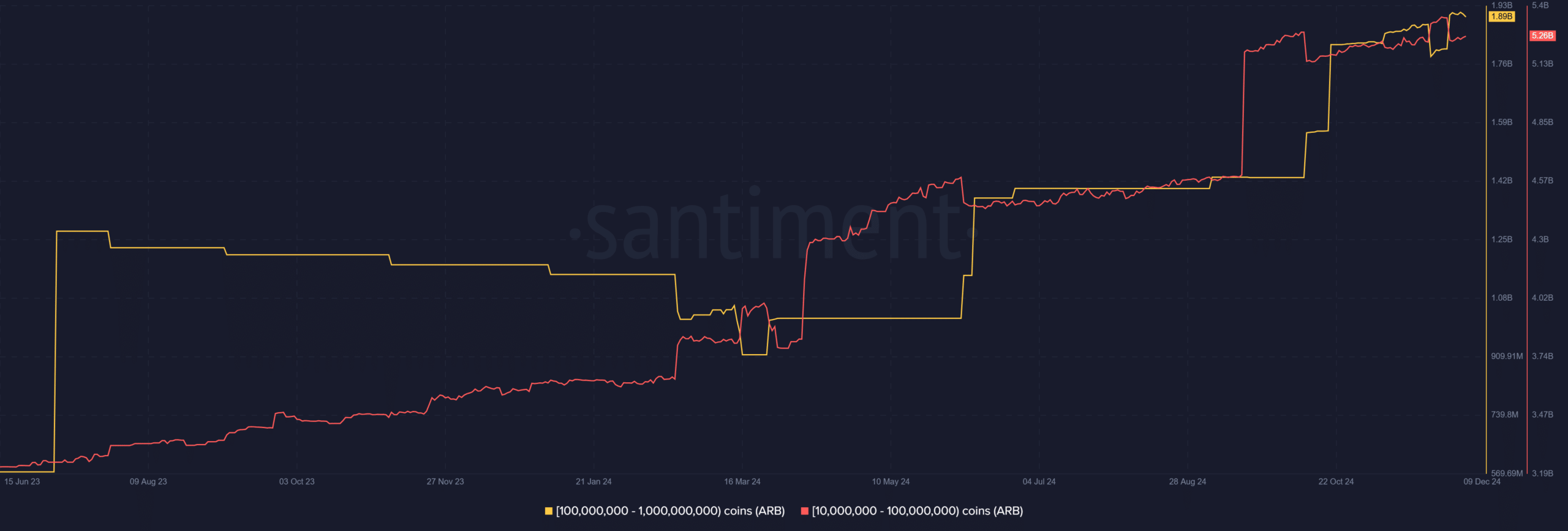 Interestingly, the movement of top whale wallets also expected an extra rally for ARB. Since September, top whales have increased ARB holdings from 6 billion to 7.15 billion tokens (worth $7.15B).
