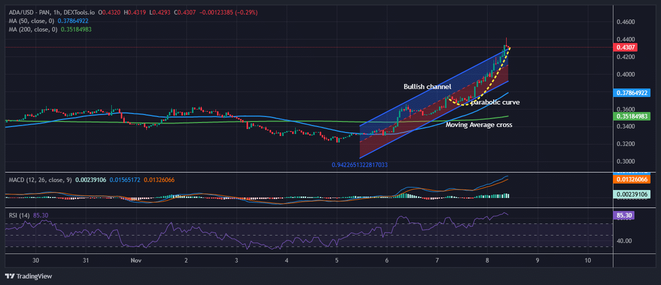 The ADA/USD 1-hour chart shows a strong bullish trend, with the current price around $0.4307 after reaching a recent high of $0.4329 and a low of $0.4293.