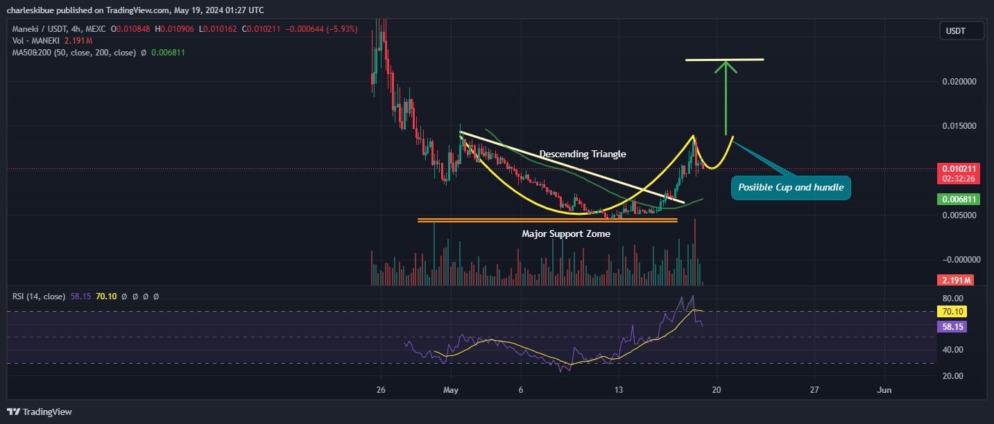 The Maneki price is on a bullish stance, as bulls drive the price high in successive bullish candlesticks for another surge to reclaim a high at $0.01405. There is a possible formation of the cup and handle pattern, which signals a continuation of the bullish trend.