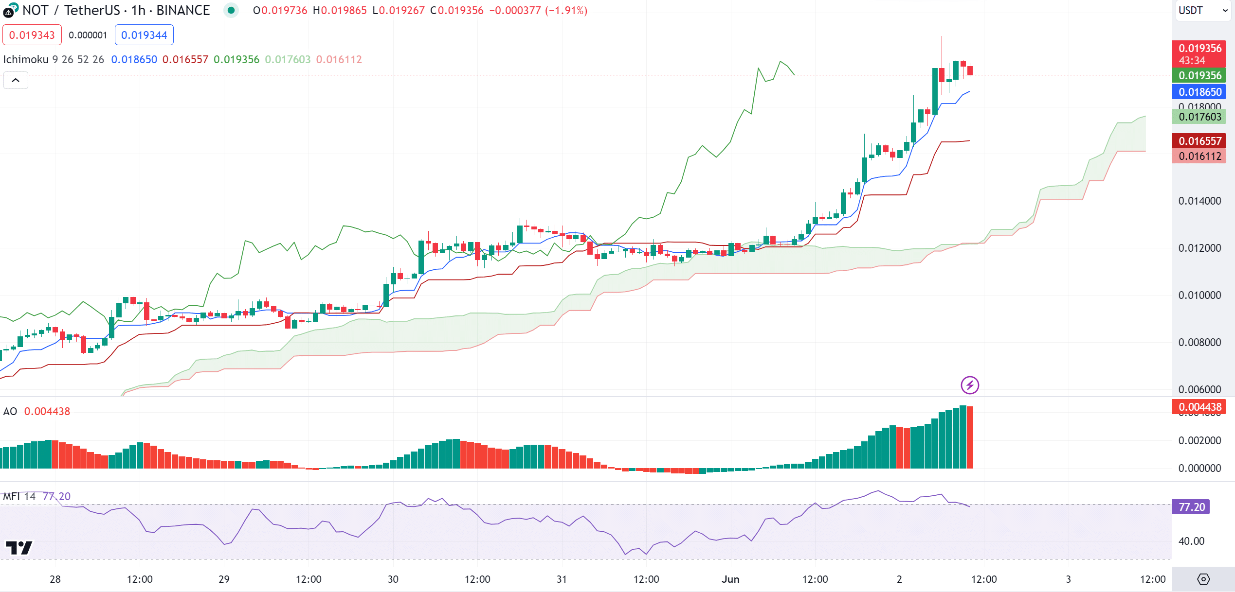 Analysing Notcoin price charts, we see it is currently above the Ichimoku Cloud, indicating a bullish trend. The conversion line (blue) is above the baseline (red), which supports the bullish sentiment.
