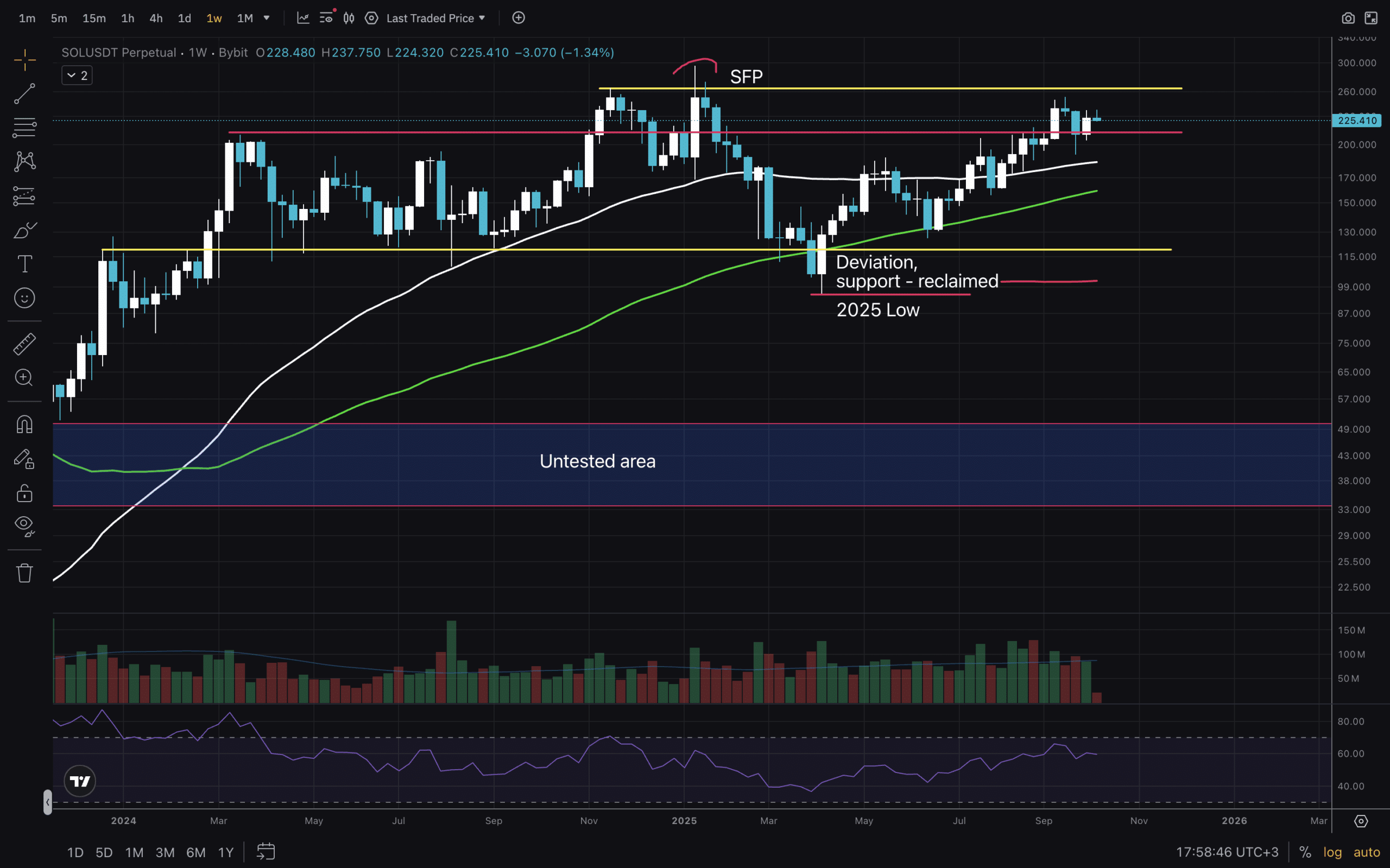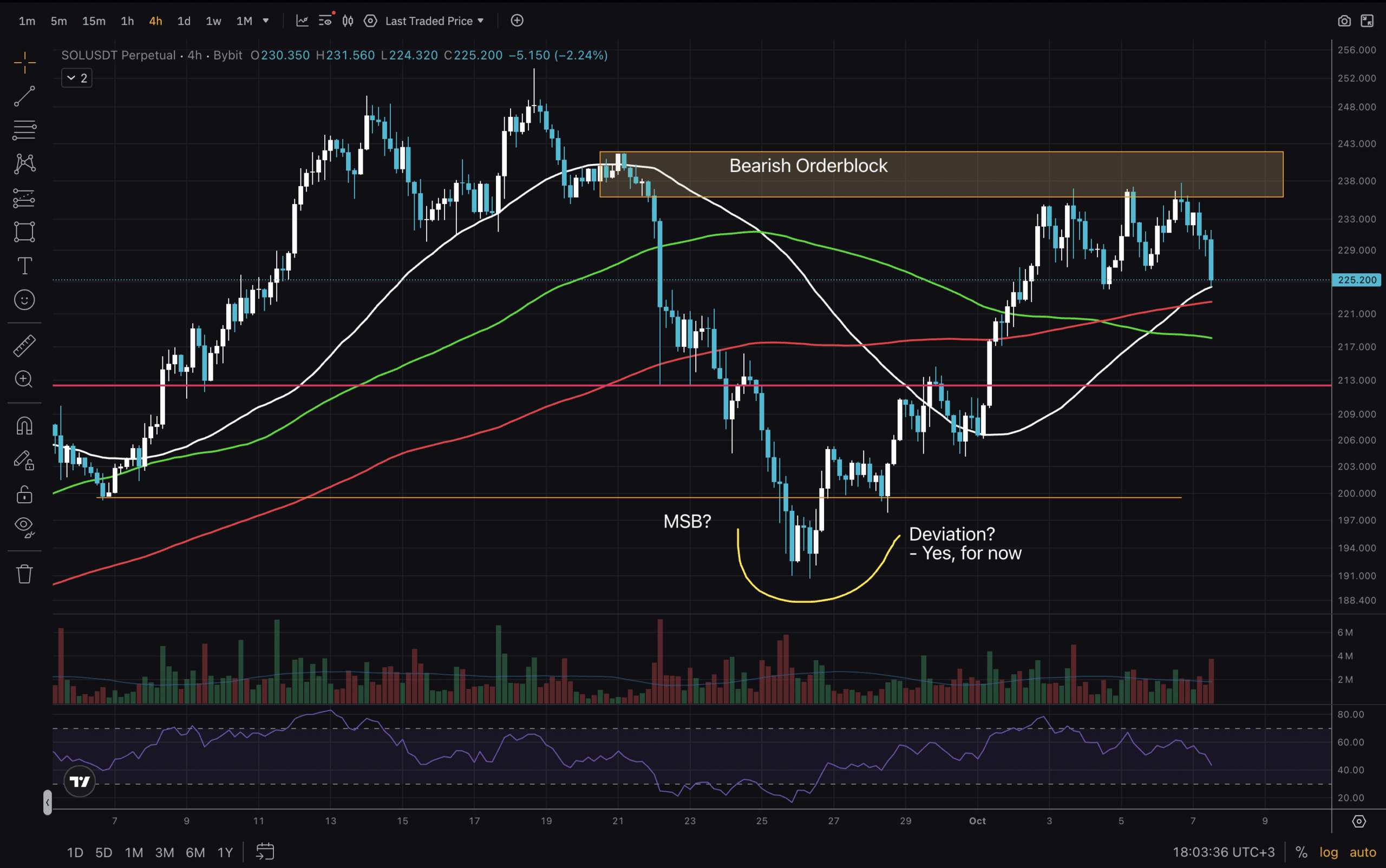 Though on the 4H timeframe we can see a retest of a Bearish Orderblock. RSI is getting reset on this timeframe. Moving averages are starting to turn upwards, with MA 50 recently breaking above MA200 and acting as support today. Next, bulls would want to see the MA100 cross over MA200 and SOL USD break above the bearish orderblock. If that does not happen, then we have a lower low and a lower high formed. Bulls need to step it up if Solana is going to hit a new ATH in Uptober.