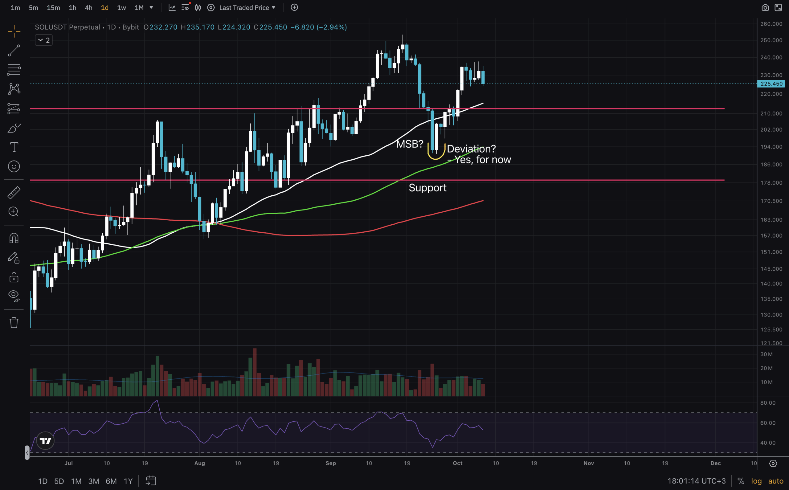 On the 1D chart RSI also has good headspace left to run. Moving Averages are also trending upward. We had a potential deviation below a previous low at $200. It won’t be a deviation if price goes down there again. Though if it does, the uptrend remains until MAs turn around and we have a clear lower high and lower low price structure.