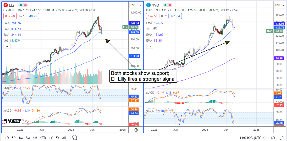 Turning to the charts, Eli Lilly looks like the better buy today. Both stocks have retreated to critical levels and show support, but the rebound in LLY is much stronger. LLY shows a trend-following entry signal, while NVO reveals potential for lower prices. It is still below the 30- and 150-day exponential moving averages, showing resistance and set-up to move sideways if not fall.