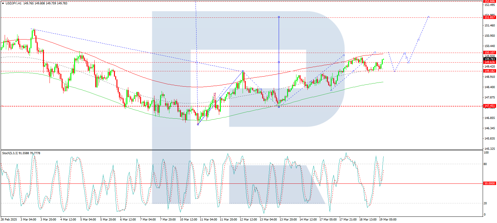 The H1 chart shows USD/JPY developing a growth wave toward 150.20, representing the midpoint of the third wave in the current structure. A consolidation range is expected to form around 149.62, with an upward breakout potentially opening the path to 151.80. The Stochastic oscillator corroborates this outlook, with its signal line above 50 pointing upward.