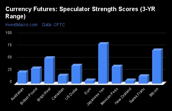 COT Strength Scores (a normalized measure of Speculator positions over a 3-Year range, from 0 to 100 where above 80 is Extreme-Bullish and below 20 is Extreme-Bearish) showed that the Japanese Yen (81 percent) and the Bitcoin (68 percent) lead the currency markets this week. The Brazilian Real (52 percent), US Dollar Index (37 percent) and the Mexican Peso (35 percent) come in as the next highest in the weekly strength scores.