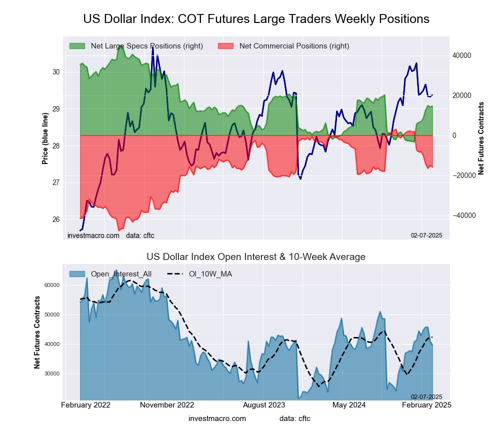 The US Dollar Index large speculator standing this week equaled a net position of 14,539 contracts in the data reported through Tuesday. This was a weekly advance of 339 contracts from the previous week which had a total of 14,200 net contracts.