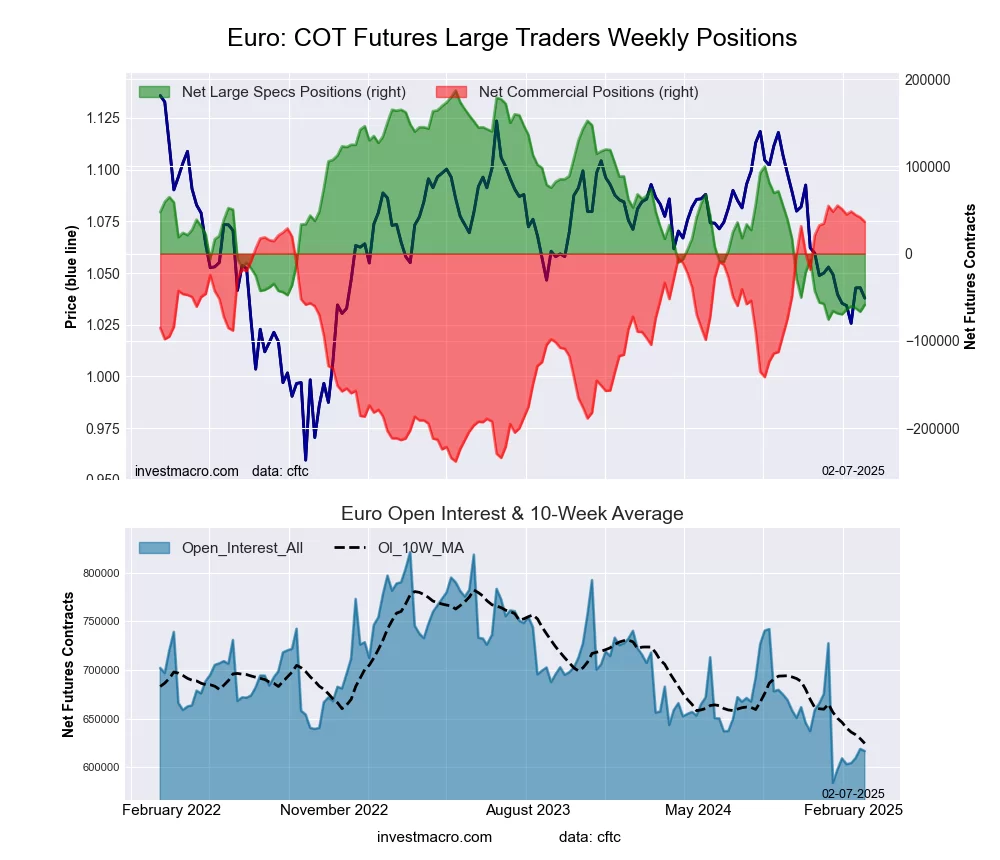 The Euro Currency large speculator standing this week equaled a net position of -58,614 contracts in the data reported through Tuesday. This was a weekly increase of 7,990 contracts from the previous week which had a total of -66,604 net contracts.