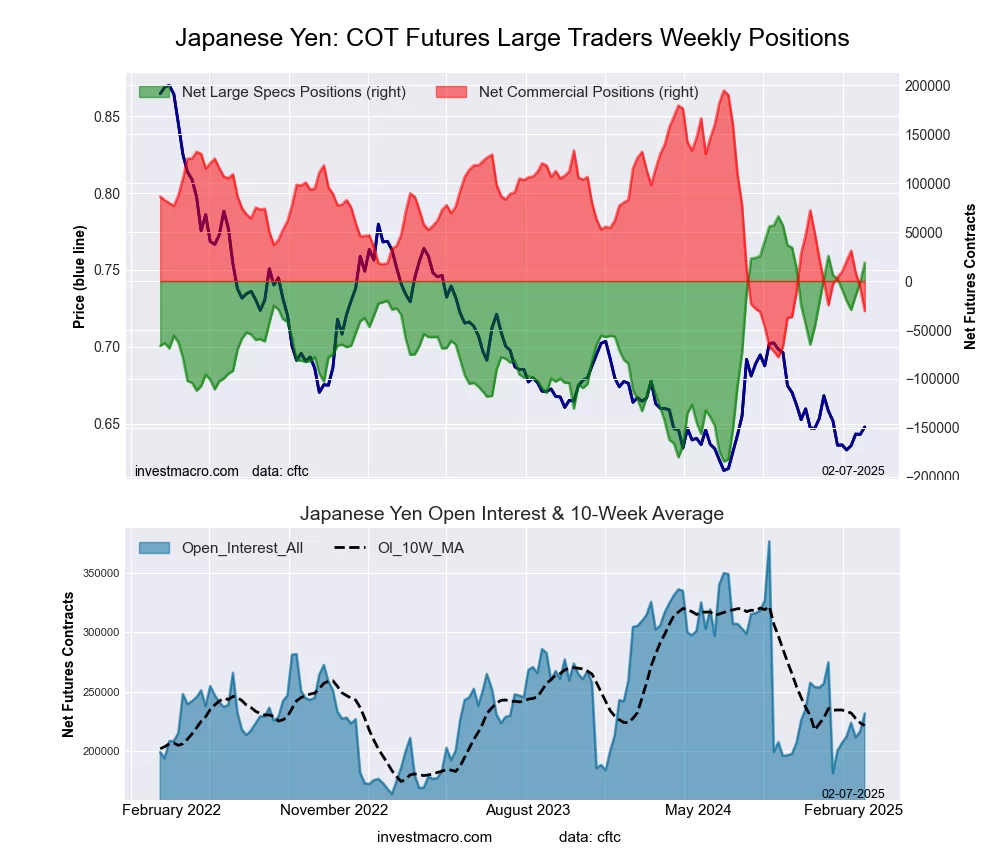 The Japanese Yen large speculator standing this week equaled a net position of 18,768 contracts in the data reported through Tuesday. This was a weekly rise of 19,727 contracts from the previous week which had a total of -959 net contracts.
