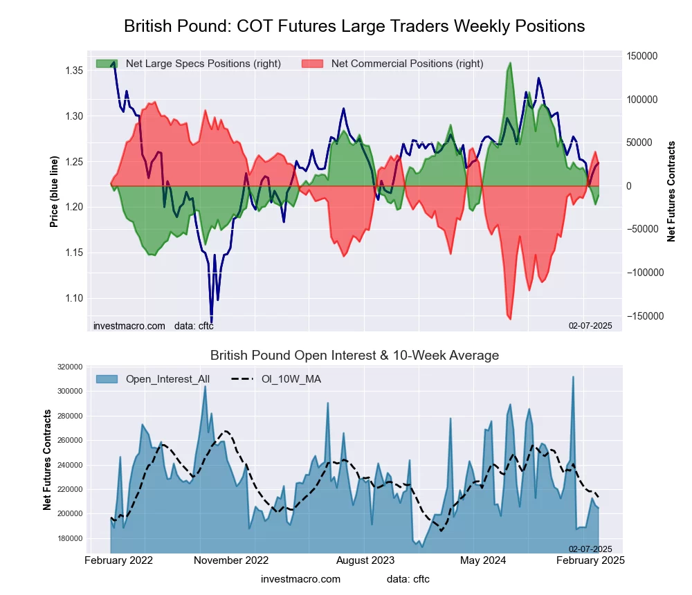 The British Pound Sterling large speculator standing this week equaled a net position of -11,323 contracts in the data reported through Tuesday. This was a weekly lift of 10,349 contracts from the previous week which had a total of -21,672 net contracts.