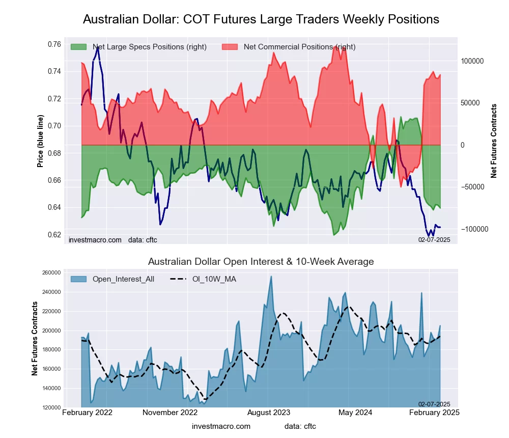 The Australian Dollar large speculator standing this week equaled a net position of -75,309 contracts in the data reported through Tuesday. This was a weekly lowering of -3,478 contracts from the previous week which had a total of -71,831 net contracts.