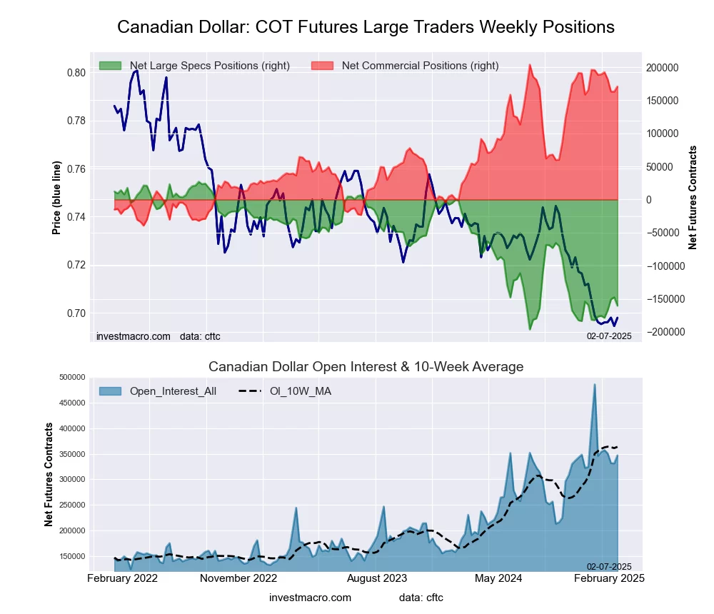 The Canadian Dollar large speculator standing this week equaled a net position of -160,444 contracts in the data reported through Tuesday. This was a weekly reduction of -12,843 contracts from the previous week which had a total of -147,601 net contracts.