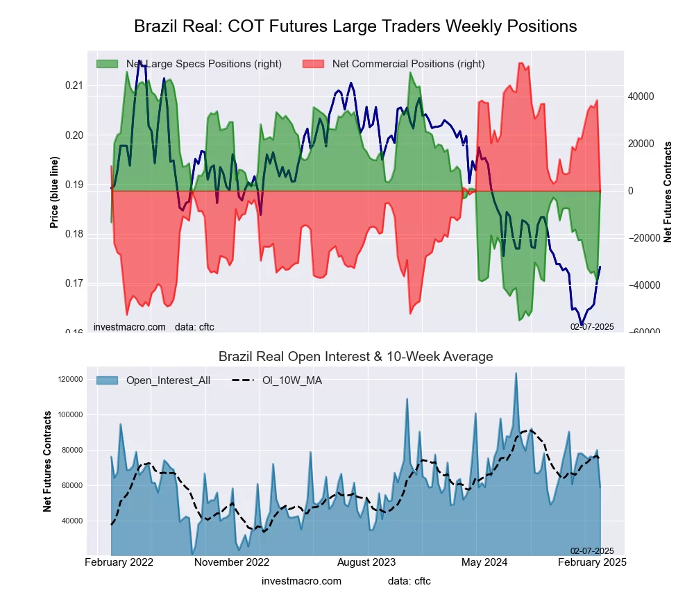 The Brazilian Real large speculator standing this week equaled a net position of 242 contracts in the data reported through Tuesday. This was a weekly rise of 38,736 contracts from the previous week which had a total of -38,494 net contracts.
